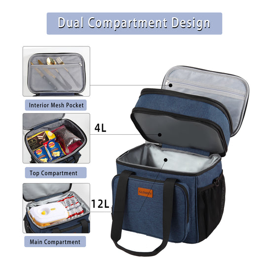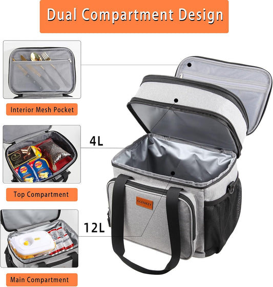 GLENKEY Double Deck Large Lunch Box, Insulated Heavy Duty Lunch Bag Waterproof Leakproof Durable Cooler Bag for Men Women Adults Work Picnic Camping Daytrip,16L,Grey