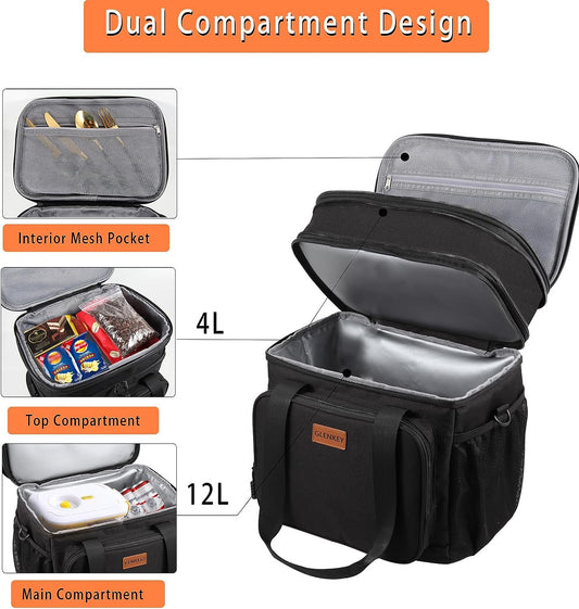 GLENKEY Expandable Insulated Large Lunch Box, Double Deck Heavy Duty Durable Lunch Bag Leakproof Cooler Bags for Men Women Adults Work Shift Flight Beach Daytrip, 20 Can, Black